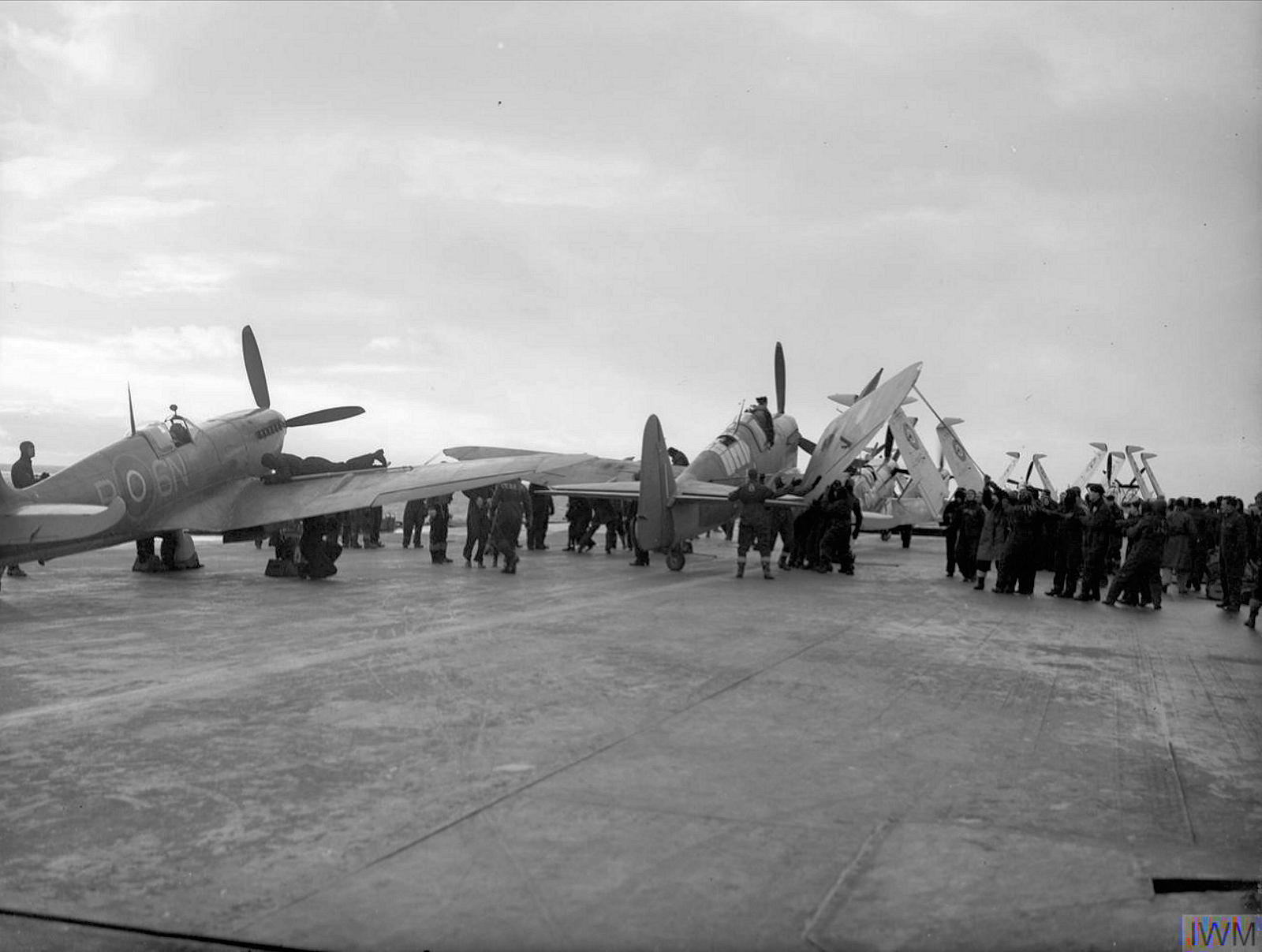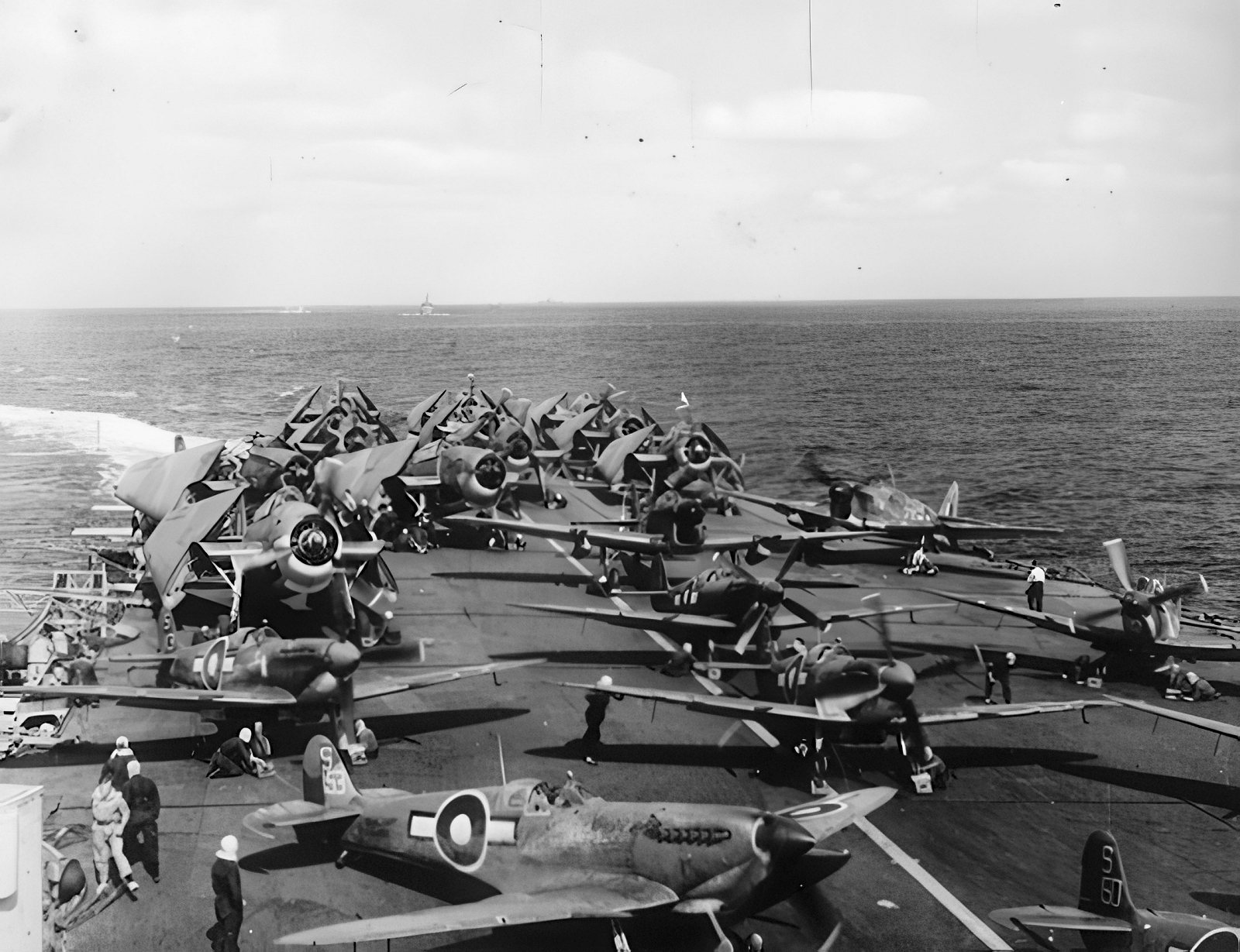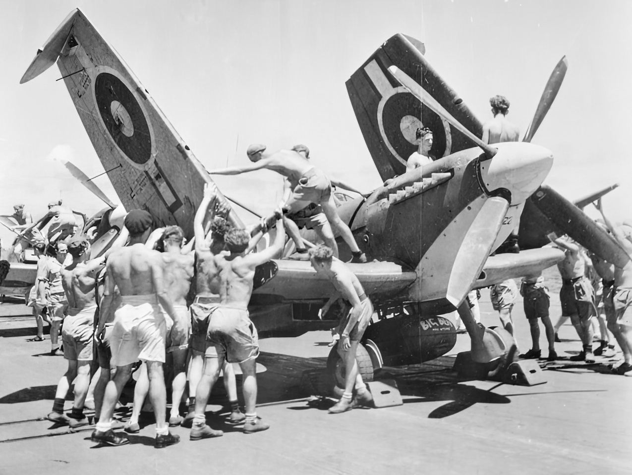 Off the coast of Norway, August 26th 1944. The aircraft handling party is folding the wing of a recently landed Firefly, ready to move it into the deck park. Seafire ‘P6N’ of 894 squadron has also just landed and waits to have its wings folded and moved next. There are several Seafires in the parking area with their wings folded. IWM (A21195)