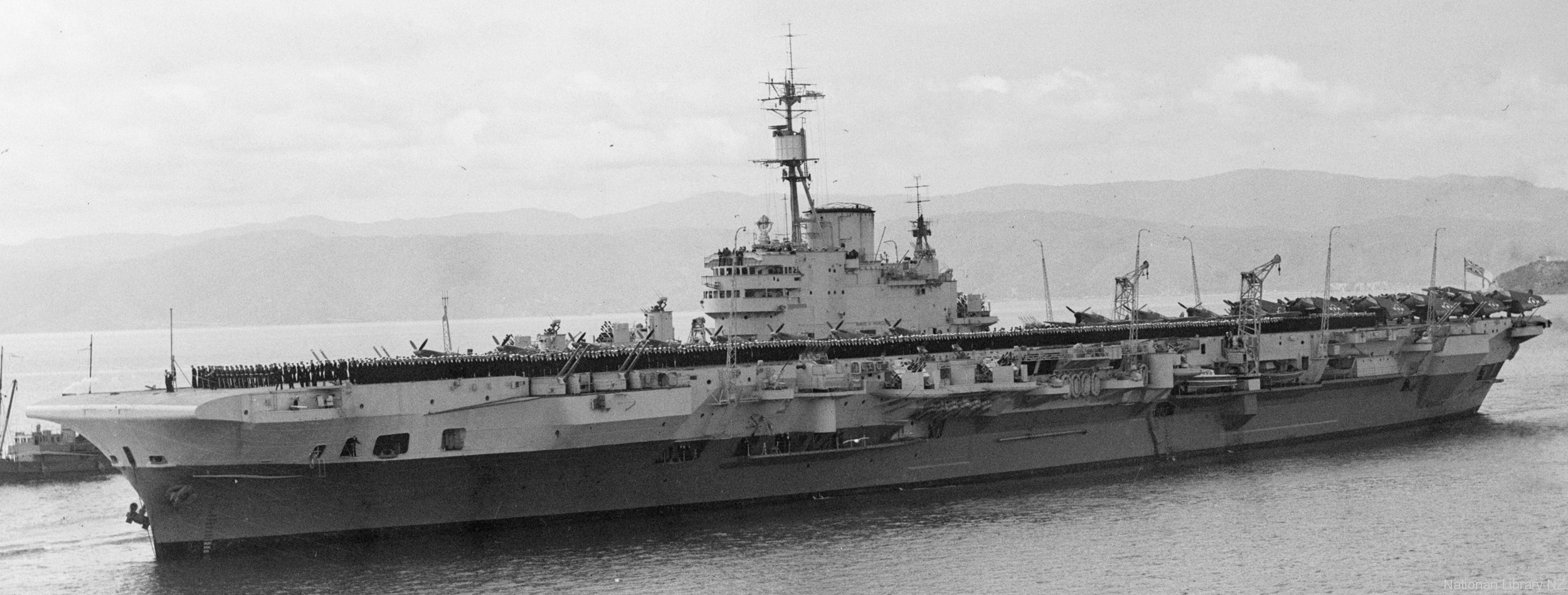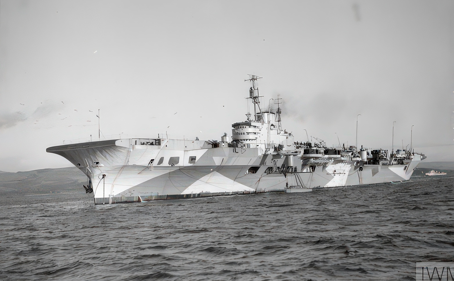 The “Implacable-class” carriers were limited in the choice of aircraft they could embark and maintain in their hangar decks; the deck head clearance was only 14 feet, so the Chance-Vought Corsair, with a height of 16 feet, 2 inches with its wings folded, was not an option. However, all front-line aircraft in current use could be accommodated. Therefore, the fighters of choice were the British Seafire and Firefly. The Torpedo Bomber, part of the carrier's air power, was initially the British Barracuda, later replaced by the American Avenger. Examples of these aircraft flew out to operate from the ship, which put to sea daily; for instance, on the 24th, Safire LR840 operated from the ship, and Firefly Z1892 from No. 1770 squadron broke a tailwheel during a landing. On completion of trials on the 24th, the ship moored off Greenock in preparation for a major flying trial to be conducted the following day. History was made on March 25, 1944. Sailing from Greenock at 10:45, she was to receive the specially modified De Havilland Mosquito FB. VI, LR359, piloted by Lieutenant Eric Brown RNVR, who successfully landed on and took off the deck, this was the first time a twin-engined aircraft had ever been operated from a British carrier. She moored in Belfast Lough at 18:45. Sailing again at 07:45 pm on the 27th, she returned to Greenock on completion of her flying trials. She remained at her moorings until April 4th when she passed up the Clyde to return to her builder’s yard for alterations and repair work to be carried out. After a month in the hands of John Brown & Co., she was officially accepted by the Admiralty on May 3rd 1944. She returned to Greenock on May 6th to commence post-alteration shakedown.