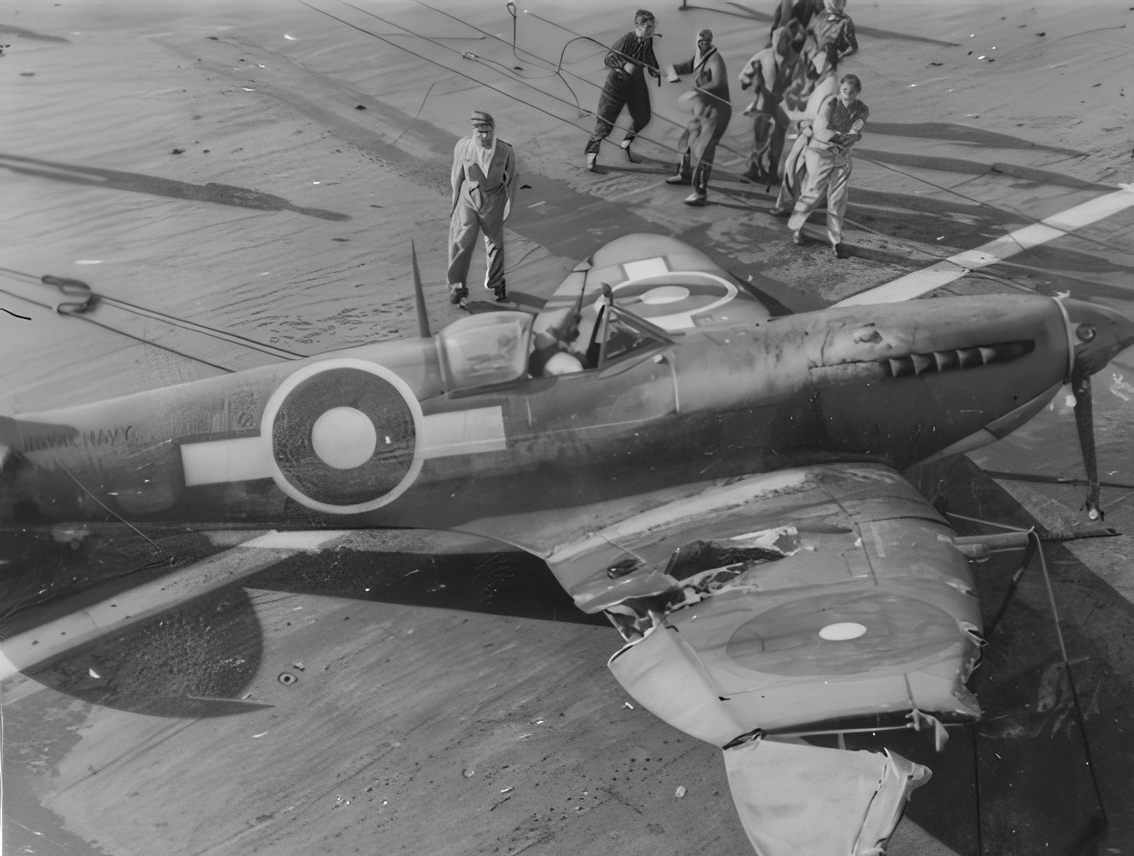 For the Seafires of 24 Wing, the decision to send them across country to join a ship that was less than 10 miles from them at RNAS Lee on Solent was a costly one; many of the new pilots had only recently qualified, and the prospect of a mass formation navigating to Anglesey was daunting. Bad weather in the Midlands resulted in the flights being separated. While most climbed above the clouds to regroup and continue, others made emergency landings at nearby airfields and resumed their flights when the weather cleared. One pilot, Sub-Lt J.V. Brooke RNVR of 894, failed to arrive at RAF Mona. he was killed when he crashed at Netley Hall, nr Donnington, Shropshire, in an 894 Squadron Seafire, LR872 ('1W'), on November 20th. The following day, Sub-Lt P.D. Norman, RNVR (894 Sqn) died when embarking in INDEFATIGABLE, his aircraft NN309 stalled into the sea from 300ft. Three aircraft had barrier crashes; on the 20th, Sub-Lt C. B. Erl, RNVR, landing in NN627 (894 Sqn) bounced on the after lift, and struck the barrier; on the 21st, Sub-Lt J. Birtle, RMVR (894 Sqn) in NN3232 floated over all the wires and crashed into the barrier; also on the 21st, Sub-Lt B. K. Swart, RNVR (894 Sqn) in NN154 missed all the arrestor wires, entered the barrier, and the aircraft ended on its nose. Not all of the stragglers made it to the ship, the last pilot to attempt to rendezvous with the ship, Sub-Lt C. Miseldine, RNVR (894 Sqn) could not manage to find her, the ships radar and homing beacon were malfunctioning and he eventually abounded his efforts and flew back to Lee-on-Solent; He eventually joined the ship at Port Said.