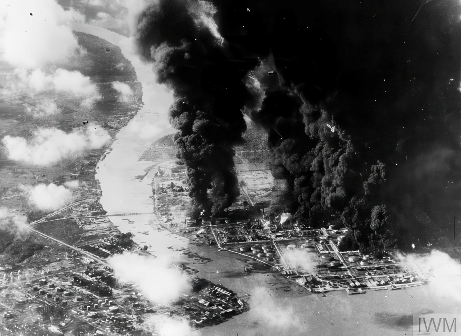 Hellcats from 5 Wing INDOMITABLE shot down six enemy fighters (two Ki-45 ‘Nick’, two Ki-44 ‘Tojo’, and one Ki-43 ‘Oscar’) and damaged three more during the raid. From 1844 Squadron, Sub-Lt L. E. J. Hawkins RNVR, in FN383 ('R6F'), struck a ‘Tojo’ in the port wing at 08:00, south of the Pladjoe oil refinery, causing it to dive steeply. At 08:15, Sub-Lt E. T. Wilson, in JW731 ('R6L'), shot down a ‘Nick’ (shared with the flight leader, Lt A. B. Macrae RNZNvR, in FN431 ('R5H')), followed by a ‘Tojo’, which he left smoking and out of control as it dove over Palembang. From 1839 Squadron, Squadron Lt. Cdr S. F. F. Shotton, in JX758 ('R5A'), attacked a ‘Tojo’ at 08:00, possibly hitting it, before shooting down a ‘Nick’ with its port engine ablaze over Palembang at 08:30. Sub-Lt R. F. Mackie RNZNVR, in JV141 ('R5G'), shot down a ‘Tojo’ at 08:00 before his own aircraft was hit by anti-aircraft fire; he made a safe return to the ship. Lt W. F. H. Schwenk RNVR (aircraft not identified) also damaged one ‘Oscar’ and probably destroyed a second before his own aircraft sustained damage over Palembang at 08:00.