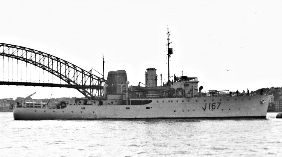 Four days later, she was moved by tugs at 07:10 to Fitzroy Dock for dry docking, emerging on the morning of the 16th and secured alongside Oil Wharf, Garden Island. At 15:00, she sailed for Melbourne to report to the Senior Officer, 21st Minesweeping Flotilla in BALLARAT for A/s and M/S operations. The Flotilla operated out of Melbourne for the remainder of December, returning to Sydney on New Year’s Eve 1944. Minesweeping and A/S sweeps were carried out slowly along the New South Wales coast, operating out of Sydney. On January 4th 1945, Lt. Cdr P. J. Sullivan, RANR(S) arrived on board to take over as commanding officer while the ship was operating in Jervis Bay. The Flotilla returned to Melbourne on March 6th.