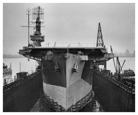 Flight deck extension, May 1944: Removal of the original round0down in preparation for fitting its extension. This is probably REAPER in berth 5. Image: e000762205 Ronny Jaques / National
