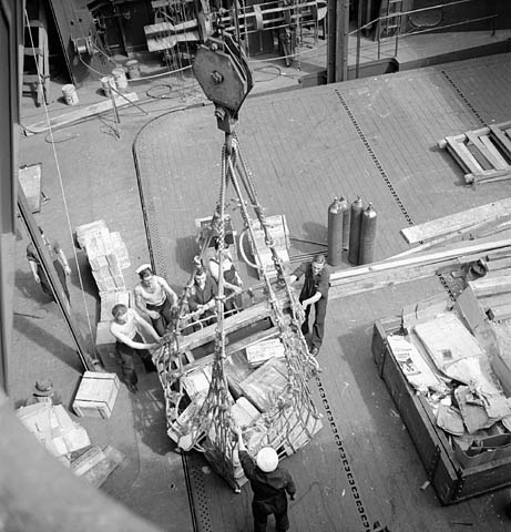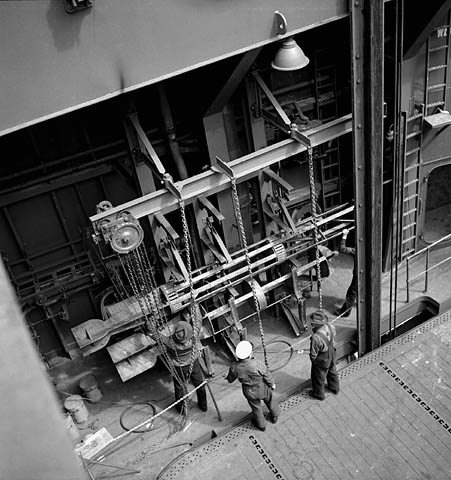 Installing twin Oerlikon gun mounts in place of single ones, May 1944: Single twin mounts are installed on either side of the bow. Image: e000762563 Ronny Jaques