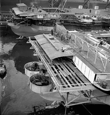 Flight deck extension, May 1944; PATROLLER is in berth 3, nearest the camera, with the extension half done while THANE is in berth 4, her extension has been completed. Image: e000762205 Ronny Jaques