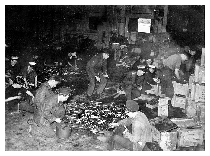 1944: De-ammunitioning HMS NABOB in the Firth of Forth before she is