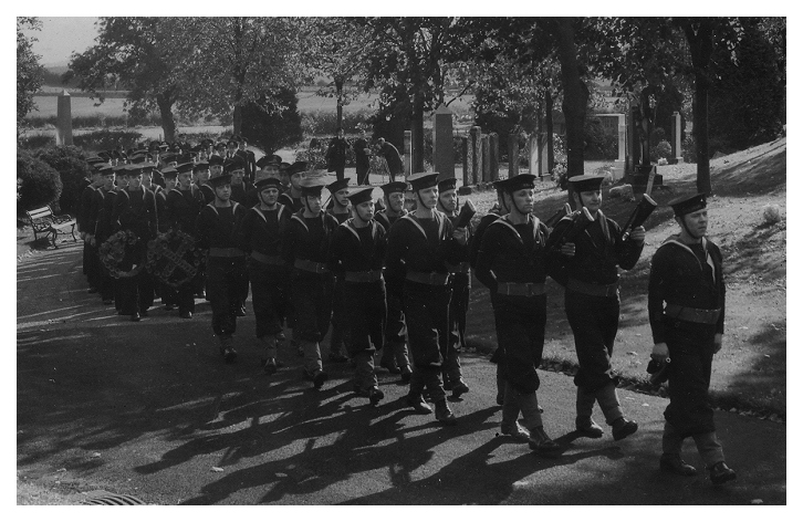 Members the the ship's company of HMS NABOB attend the burial of FX