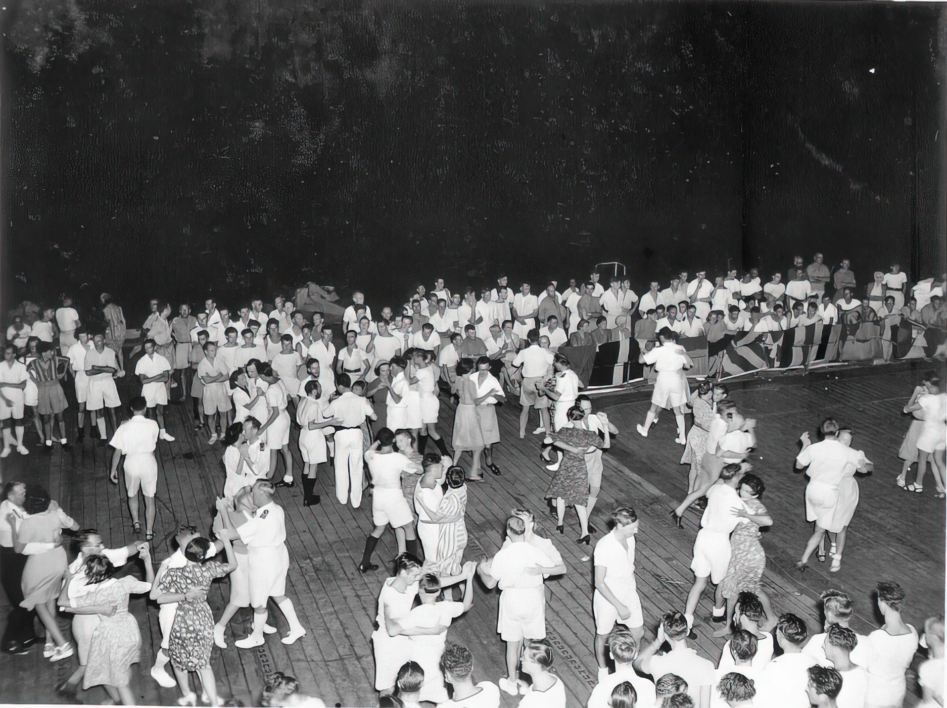 Former internees and POWs are entertained with a dance on the flight deck aboard SMITER shortly after leaving Hong Kong Harbour in late September 1945, on passage to Ceylon. Photos: Courtesy of Terry Oxley