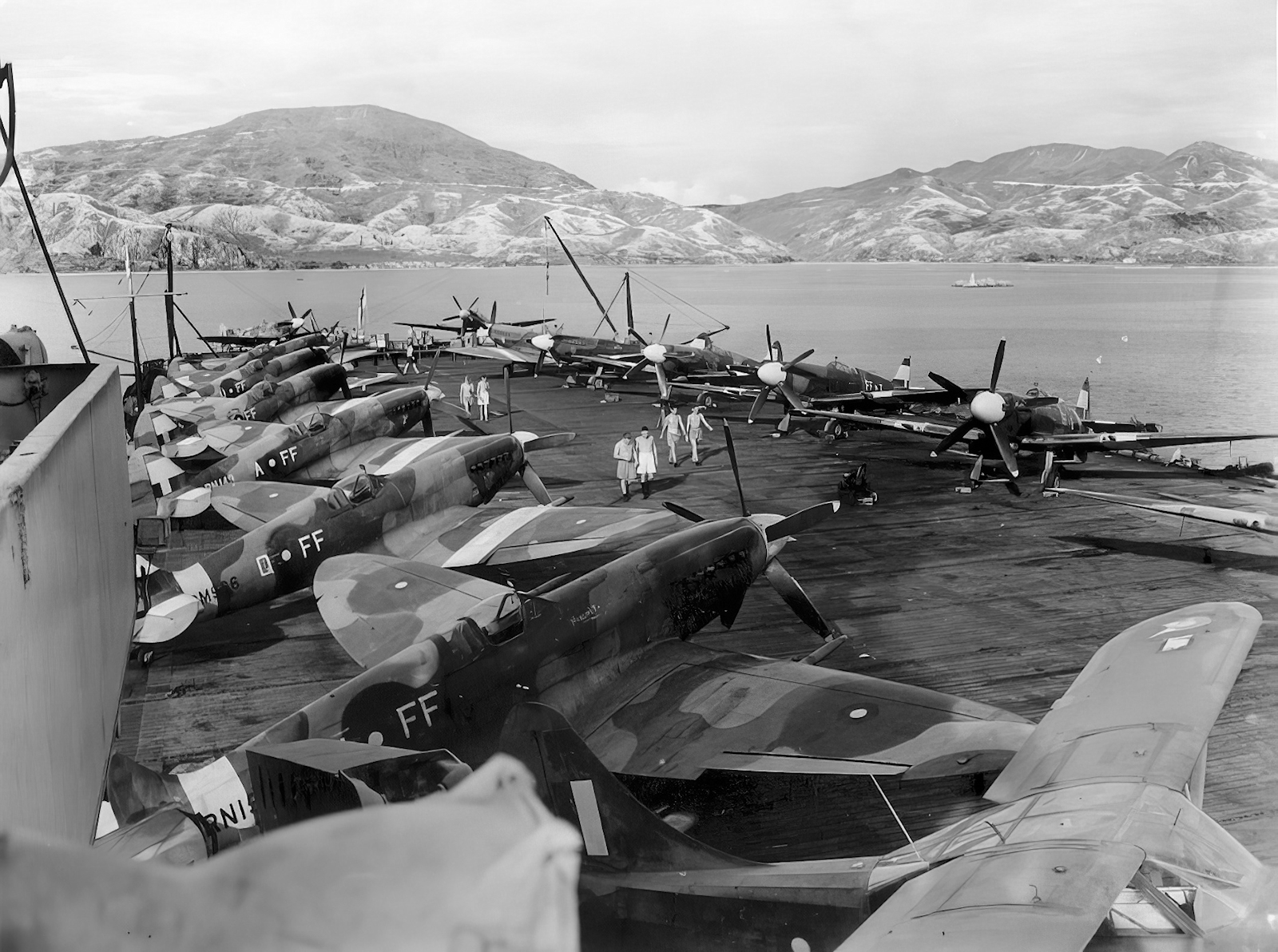 Spitfire Mk.XIVs of No 132 (City of Bombay) Squadron RAF aboard SMITER in Hong Kong Harbour, September 1945. There is also a single Stinson Reliant communications aircraft (nearest camera). Photo: Courtesy of Terry Oxley