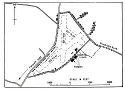 The polo ground, which bordered the Plymouth to Tavistock road, was nearly 700 yards long and 300 yards wide. The two smaller fields lay to the east, alongside the road from the George Hotel to Plym Bridge. About 300 yards of the high bank and hedge that divided the polo ground from the fields was demolished and replaced by a temporary wire fence that could be removed when the RAF wanted to use the site. The hedge between the two small fields was also removed. A number of trees at the north-western edge had to be removed and the telegraph wires that ran alongside the main road were re-laid underground to give clear access.