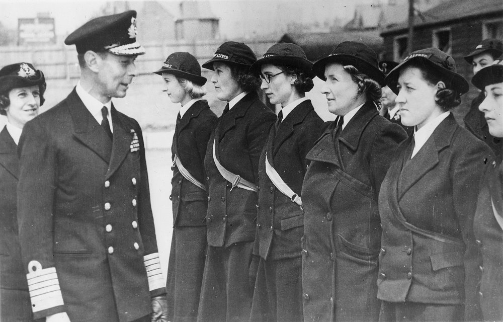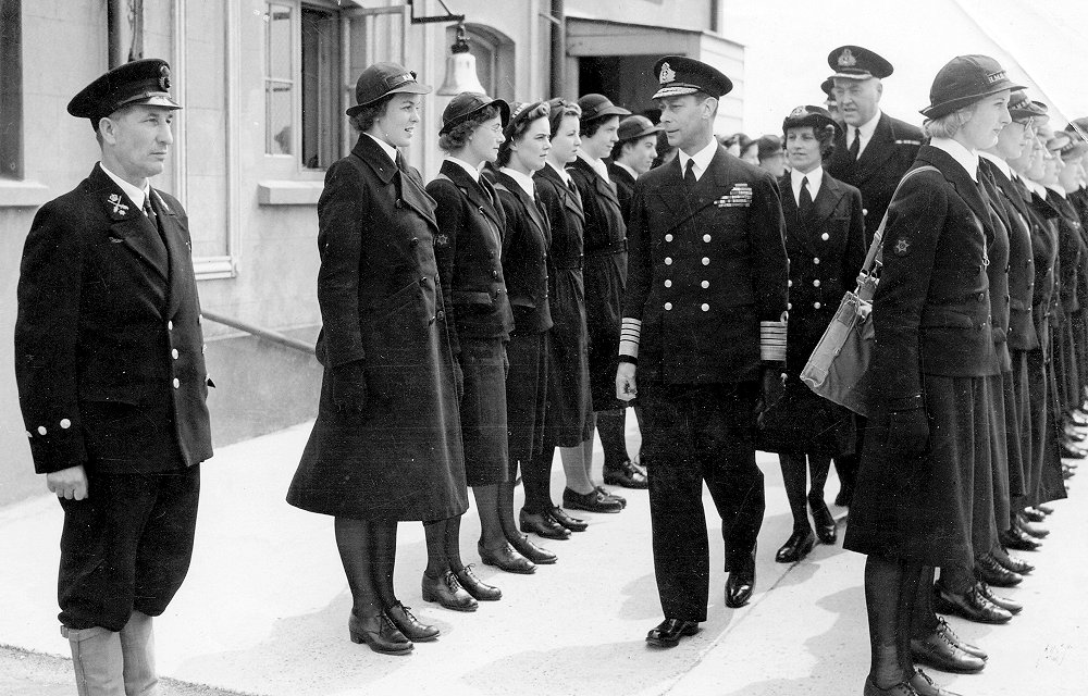 On May 29th 1941 His majesty King George VI visited the establishment and as part of his tour he inspected the WRNS. Like all naval shore establishments KING ALFRED employed a large number of WRNS personnel (colloquially known as Wrens). There were eight Wrens in the ship's company in 1939 when only Hove marina was in use; as the establishment grew a separate WRNS quarters (Wrennery) was set up in two large houses at San Remo on the Kingsway, which housed 70 wrens. By the end of the war there were 45 working at Lancing and 7 at Mowden. A number of these were locals, young women recruited to fill posts in the various sites as ‘immobile Wrens’ – enlisted into the WRNS but for service only in a specified area around their home. These Wrens wore the same uniform as regular WRNS and had the same duties and responsibilities but they lived at home and could not be drafted outside their home area. Jobs filled by ‘immobile’ Wrens included cooks, stewards, typists and store clerks.