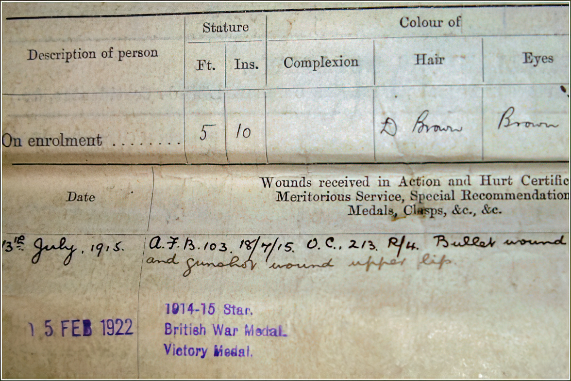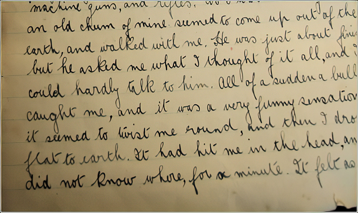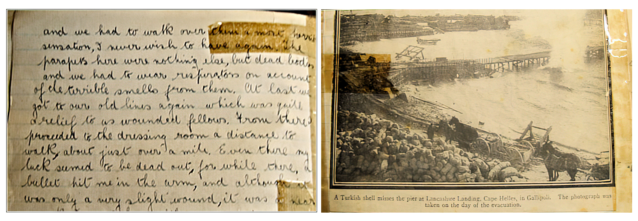 All of a sudden a bullet caught me, and it was a very funny sensation for it seemed to twist me round, and then I dropped flat to earth. It had hit me in the head, and I did not know where, for a minute. It felt as if it had hit me in the neck, but I found it had gone through my upper lip then into my tunic, at the top of my arm, just missing my arm. I was lying there in the open, feeling somewhat dazed wondering what to do next, so I raised myself just a little, and I saw that the advance trench was about 30 to 40 yards in front, and also a few of my poor comrades lying dead near me. Then I thought that I would make a move towards the trench, but just as I was about to go I heard a rattle of bullets just over my head. I stopped, and to my horror found they were trying to finish me of [sic] with a machine gun. I began to give myself up as finished, when I saw a large hole just beside me, ( made by one of the Turkish shells) which I thought would make good cover for me, but my second thoughts proved to save my life. I had made up my mind to crawl forward and just as I did so another shell burst into the hole. This gave me a good shaking up, but at last I gained my desires, yet still they could not let me alone, for the snipers were still trying hard for me.