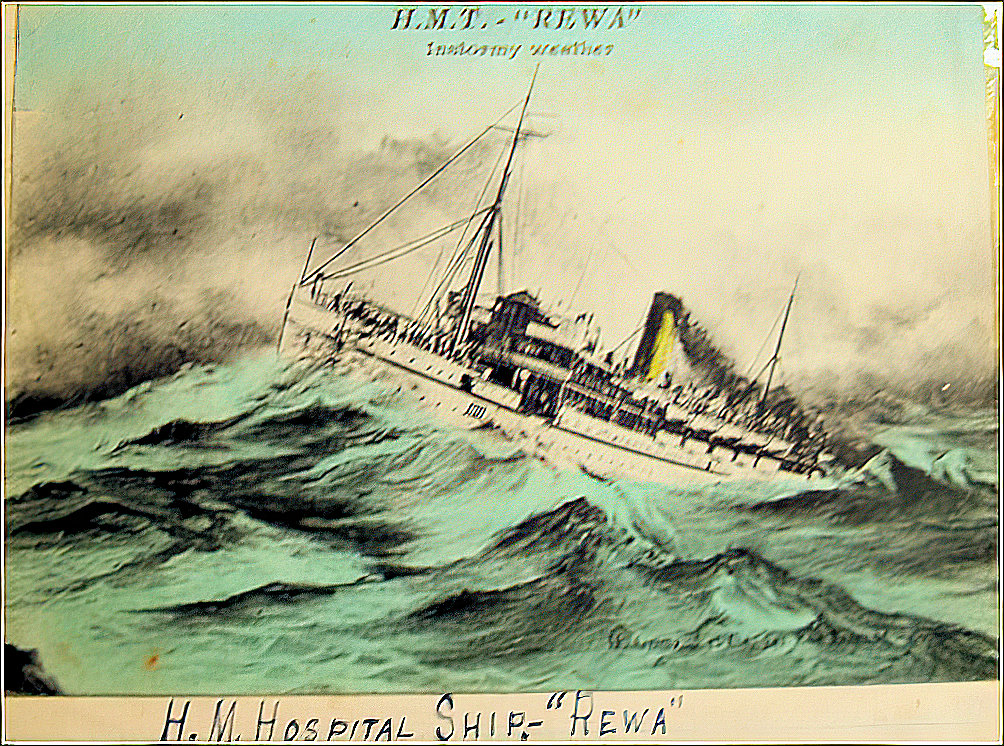 Then we were taken down to the famous Lancashire Landing, and embarked on a barque which towed us, from two hundred to three hundred yards, to the Hospital ship 'Rewa[. While on the way to the ship we had the shells coming at us, splashing the water all over the place, but eventually we got to the ship in safety.