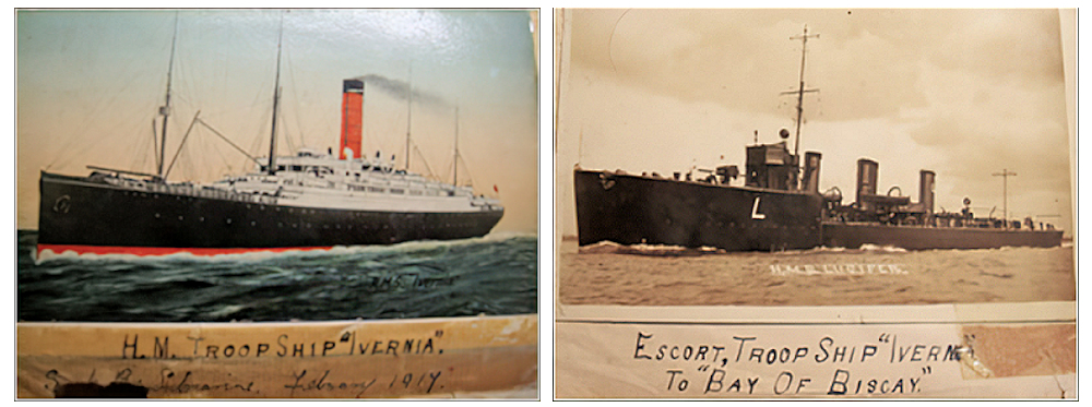 It was a glorious day in the first week of May, when we said farewell, to the folks of Blandford. People had come from miles around, to see us leave and wish us good luck. Mothers, wives, and sweethearts all saying goodbye to their loved ones, and it gave one such a feeling, that we were glad to get away from that scene of farewell. We left Blandford with the long journey to Plymouth before us, and in arriving there, proceeded to embark on the troop ship HMS Ivernia (sunk by submarine UB 47 Jan 1917~ RJH) which was aside the quay waiting for us. There were several other troopships, so it was a very lively scene, boarding the different boats.