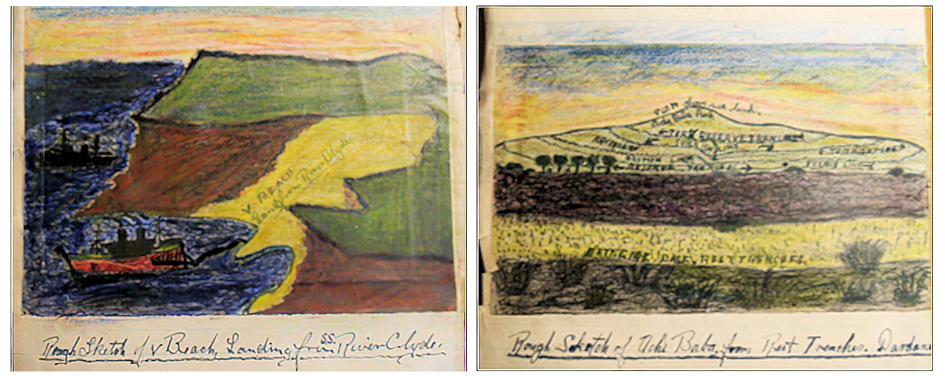 On passing this wreck, we landed on the famous V Beach, by way of the well known ship River Clyde, which was run ashore in the first landing (25th April 1915~ RJH) to help cover the troops while landing. From the string of smaller boats which ran from the Clyde to the shore, forming a kind of bridge we were able to get to the shore without having to wade. The River Clyde has been termed the Ship of Troy on account of the splendid way it was built. After landing from this famous bridge of boats the picture presented to me was very grim, and it seemed to tell me that our business here was going to be somewhat of a serious nature.