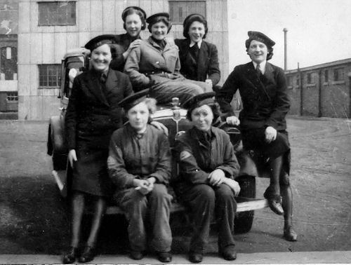 Wrens from HMS CAROLINE, pictured at Pollock dock, Belfast - Peggy is sat on the bumper (right)