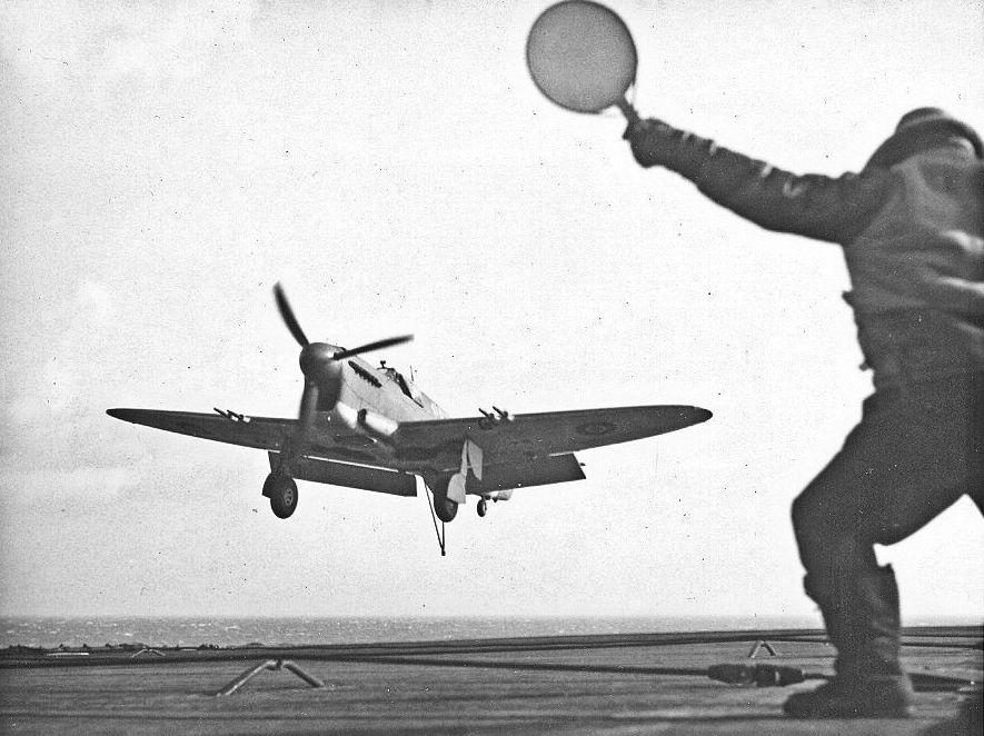 For most of the war candidates for Deck Landing Control Officer were experienced squadron pilots selected to receive three weeks intensive training, later though junior pilots were selected. The trainees had to learn the different signals used to communicate with the pilot using high visibility paddles during the day and illuminated one for night flying. These resembled tennis bats so the DLCO became known as “Bats”. Signals were given to warn if the approach was too high, too low, too fast or to lower the undercarriage or arrester hook if not already done, correct drift to port or starboard and keeping the wings level. These instructions were given until the final moment when the aircraft was over the dummy rounddown and committed to land. Should the pilot make an unsafe approach the batsman would ‘wave him off’ to return to the circuit for another approach. The prospective DLCOs also had to be familiar with the landing characteristics of the different aircraft types being operated in the Fleet Air Arm; some had restricted forward visibility on approach, both the American Corsair and the British Seafire had long noses. A straight in approach would result in the pilot being unable to see the Batsman and so required a completely different approach to the deck.