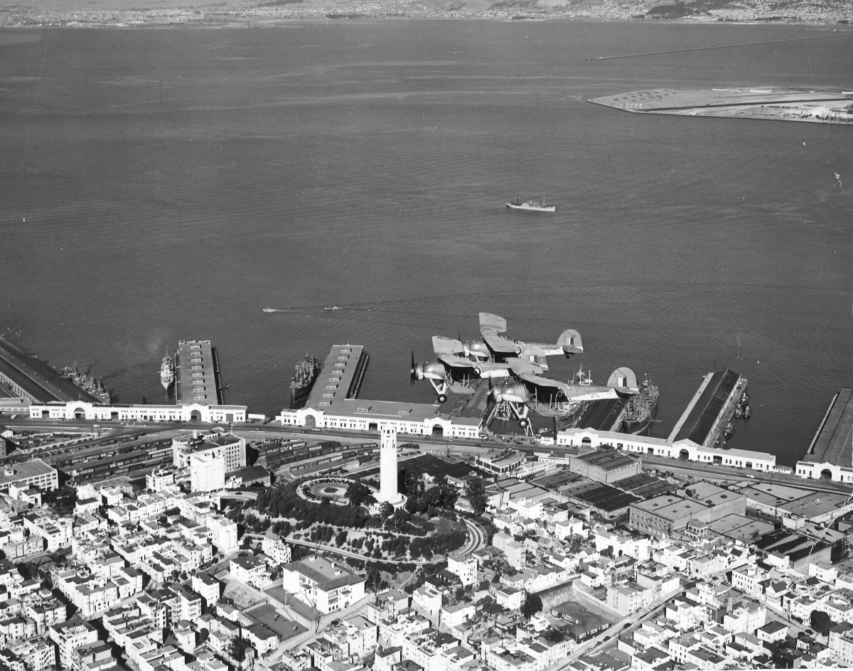 3 of the 4 Swordfish aircraft of 838 naval air squadron operating from USNAS Alemeda Island, flying over San Francisco. Photo courtesy of Dan Shumaker
