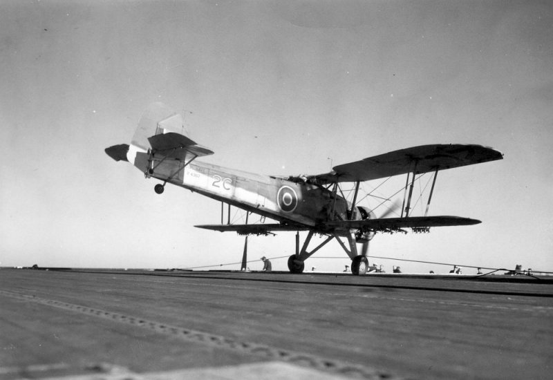 Swordfish coming into to land on a Rapana class merchant aircraft carrier after a patrol escorting an Atlantic convoy. The other three aircraft are parked in the bow, there was no hangar on these makeshift carriers. Photo Ref:VR997.011.2 courtesy of CFB Esquimalt Naval & Military Museum