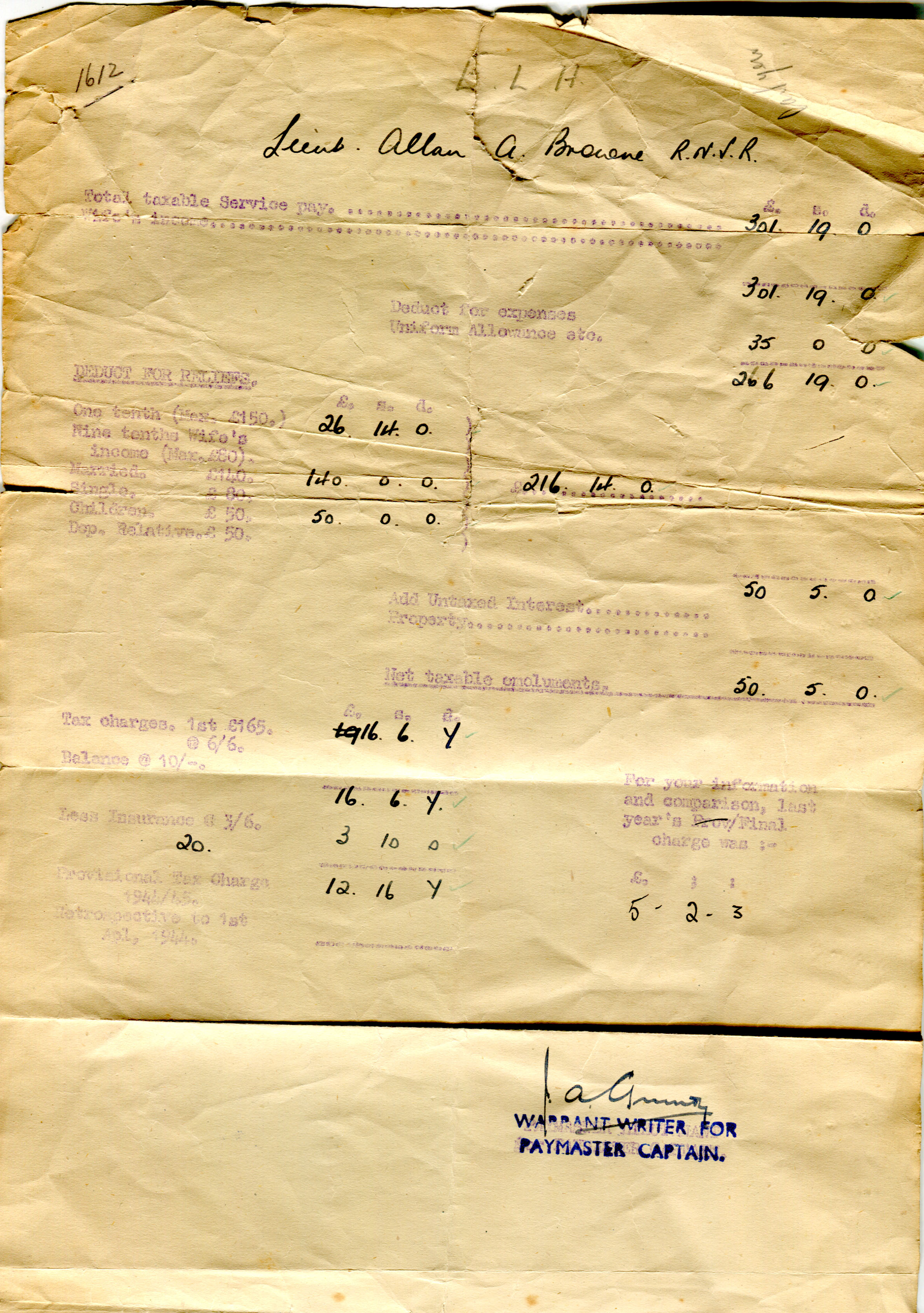 I also have a virtual P60 showing his pay, tax and allowances, from which I note that the Navy was allowing £50 pa for my own upkeep. Unfortunately, the document is undated, so it is not clear what rank is being rewarded. Still, it mentions a previous year’s pay for comparison, so I assume it is from at least 1942 and thus refers to the pay for a Lieutenant.