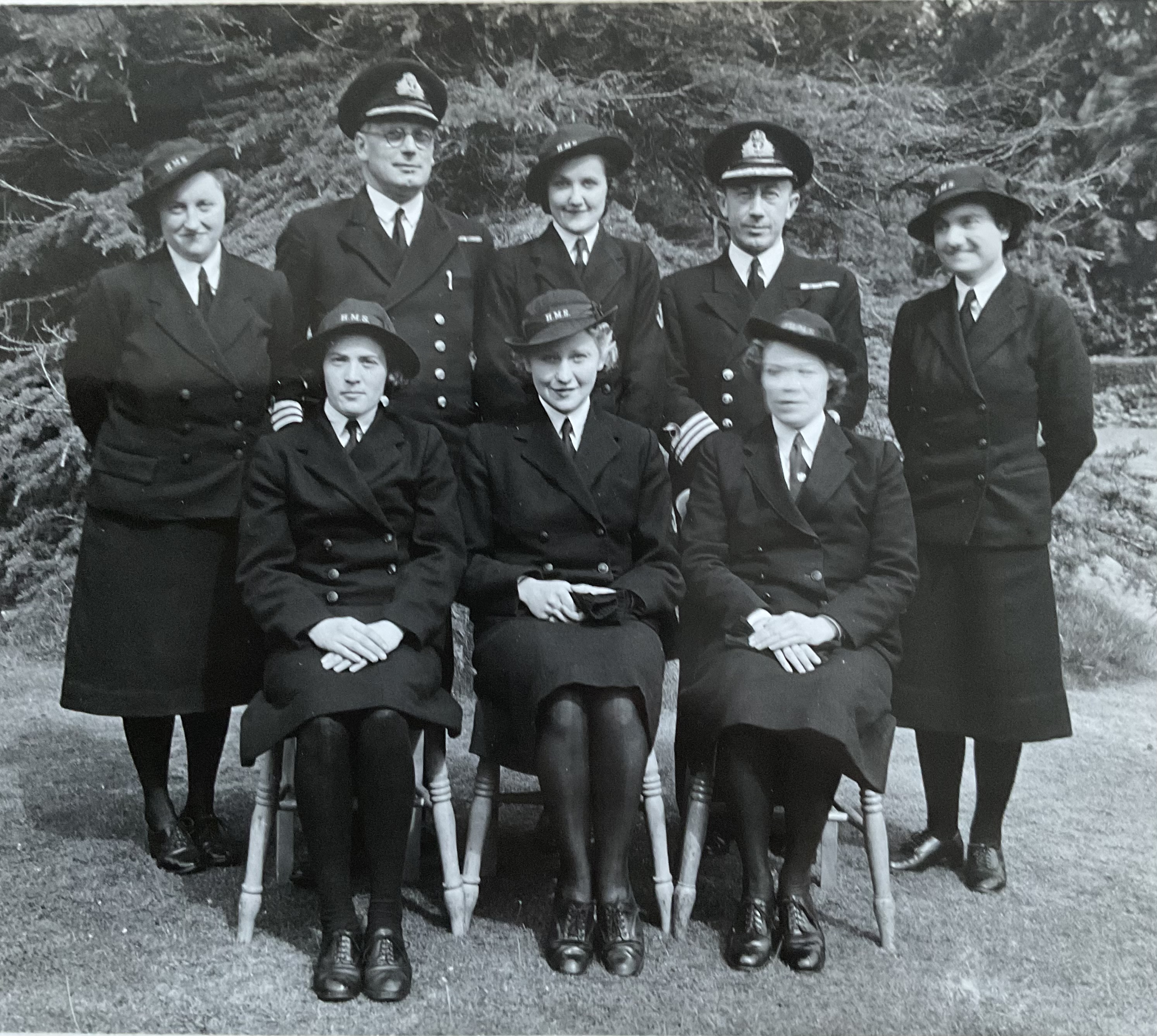 Second from the right is my father, Lieutenant A A Browne, RNVR, with a fellow Lieutenant RNVR at the end, who is either Lieutenant D C Quail or F W Harvey. In the front row are six WRNS.