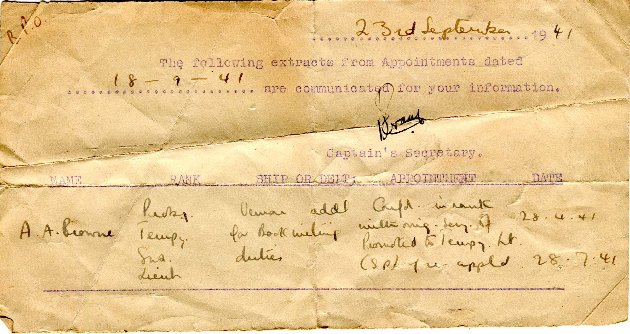 This document shows one of the formal promotion notifications for my father, appointing him as Sub-Lieutenant (Special Branch) R.N.V.R. He was promoted to Lieutenant on 23 July 1941.