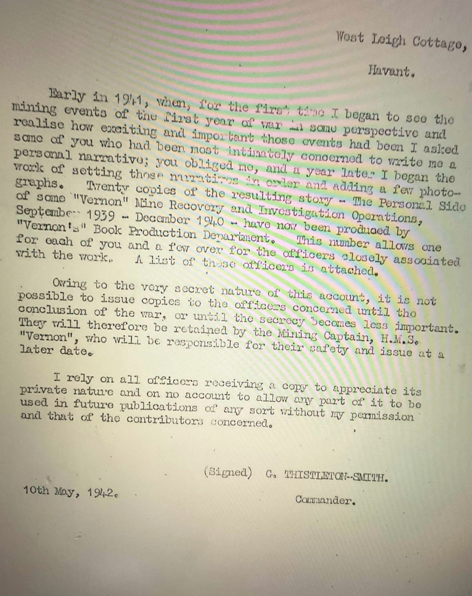 One early book produced for the (M) section of the Vernon based at West Leigh Cottage near Havant, was Vernon Pamphlet no. 370. THis was compiled by Lieutenant G H Goodman, has a preface from Commander G Thistleton Smith, which mentions that just 24 copies of this highly secret book were to be published by the Instructional Book Production Department for distribution. The 77 page Pamphlet was titled The Personal Side of Some “Vernon” Mine Recovery and Investigation Operations, September 1939 – December 1940.